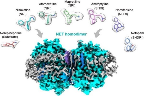 圖1. 人源NET二聚體分別與底物和六種抗抑鬱藥物複合物的代表性結構 該成果由中國科學院上海藥物研究所徐華強課題組、楊德華課題組和臨港實驗室蔣軼課題組合作完成。三個課題組合作破解了重要神經系統疾病靶標——去甲腎上腺素轉運體同源二聚化,轉運天然底物去甲腎上腺素NE,以及選擇性識別六種抗抑鬱藥物的分子密碼。 去甲腎上腺素轉運體屬於單胺類轉運體家族,是維持神經遞質平衡的關鍵蛋白之一,其功能異常與多種精神疾病,如抑鬱症、焦慮症、注意缺陷多種障礙和帕金森病等相關。 該研究成果為理解去甲腎上腺素轉運體等單胺類轉運體的生理調控機制奠定了重要的理論基礎,有助指導靶向單胺類轉運體的抗抑鬱症等神經精神類疾病的藥物研發。 世界衛生組織報告顯示,全球約有3.5億名抑鬱症患者,中國抑鬱症患者人數已超9500萬。(完) 【編輯:馬華】