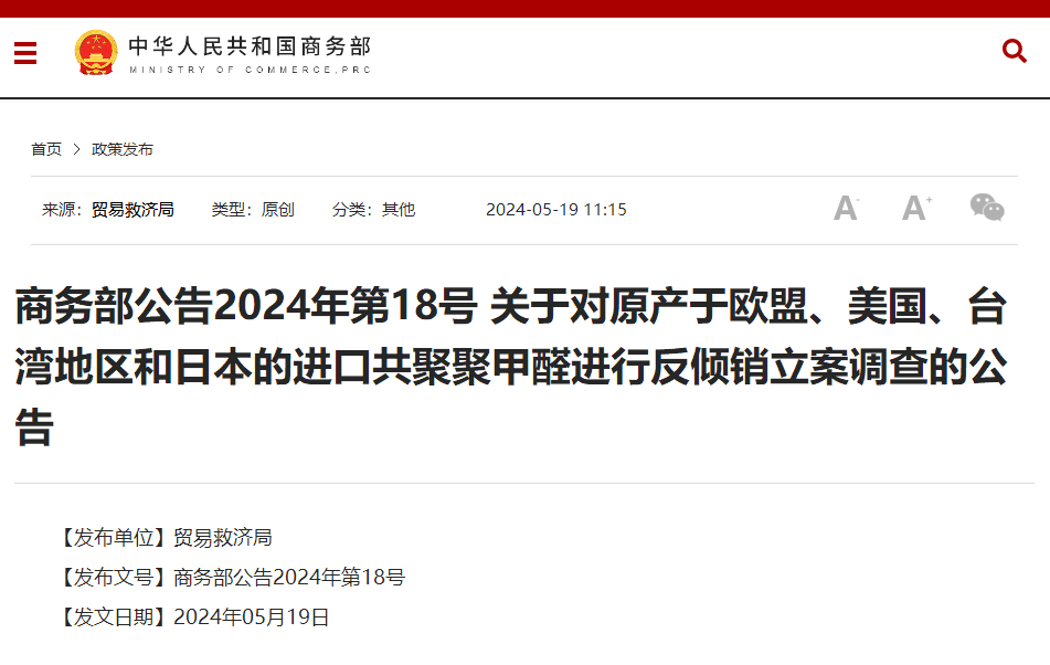 中國商務部網站截圖 商務部指,上月收到多家企業提交反傾銷調查的申請。根據初步審查,即日起決定立案調查,而利害關係方需要在20天內提交書面意見,預計調查需時一年。調查日期為2024年5月19日開始,通常應在2025年5月19日前結束調查,特殊情況下可延長6個月。 商務部稱,共聚聚甲醛具有機械強度高、高耐疲勞性等特點,可以用於電子、汽車、建築及醫療器具等領域。(完) 【編輯:丘志彬】