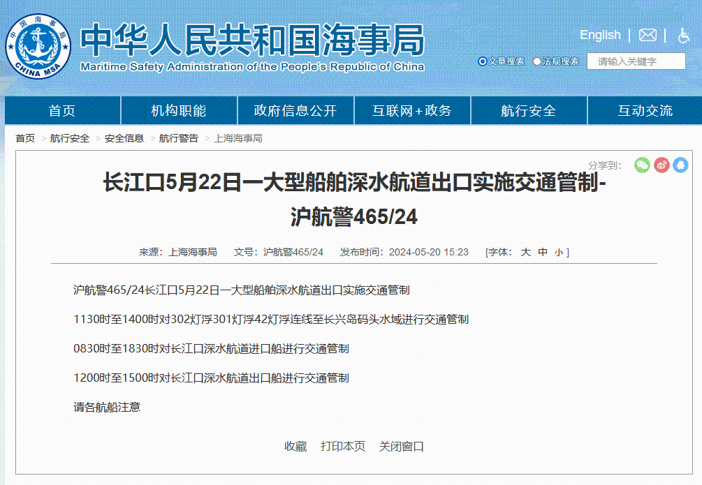 滬航警467/24長江口5月23日一大型船舶深水航道出口實施交通管制 1210時至1440時對302燈浮301燈浮42燈浮連線至長興島碼頭水域進行交通管制 0910時至1910時對長江口深水航道進口船進行交通管制 1240時至1540時對長江口深水航道出口船進行交通管制 請各航船注意 撤銷滬航警465/24 此前報道 中國海事局網站20日消息,上海海事局發佈航行警告,長江口5月22日一大型船舶深水航道出口實施交通管制。 1130時至1400時對302燈浮301燈浮42燈浮連線至長興島碼頭水域進行交通管制 0830時至1830時對長江口深水航道進口船進行交通管制 1200時至1500時對長江口深水航道出口船進行交通管制 請各航船注意