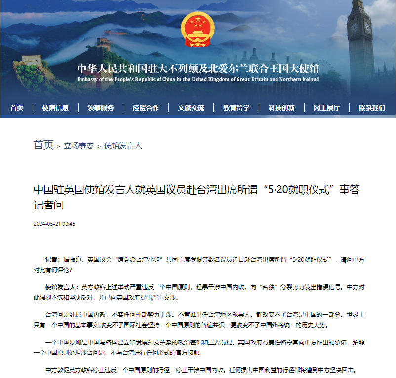 中國駐英國大使館網站截圖 記者:據報道,英國議會“跨黨派台灣小組”共同主席羅根等數名議員近日赴台灣出席所謂“5·20就職儀式”,請問中方對此有何評論? 使館發言人:英方政客上述舉動嚴重違反一個中國原則,粗暴干涉中國內政,向“台獨”分裂勢力發出錯誤信號。中方對此強烈不滿和堅決反對,并已向英國政府提出嚴正交涉。 台灣問題純屬中國內政,不容任何外部勢力干涉。不管誰出任台灣地區領導人,都改變不了台灣是中國的一部分、世界上只有一個中國的基本事實,改變不了國際社會堅持一個中國原則的普遍共識,更改變不了中國終將統一的歷史大勢。 一個中國原則是中國與各國建立和發展外交關係的政治基礎和重要前提。英國政府有責任恪守其向中方作出的承諾,按照一個中國原則處理涉台問題,不與台灣進行任何形式的官方接觸。 中方敦促英方政客停止違反一個中國原則的行徑,停止干涉中國內政。任何損害中國利益的行徑都將遭到中方堅決回擊。(完) 【編輯:丘志彬】