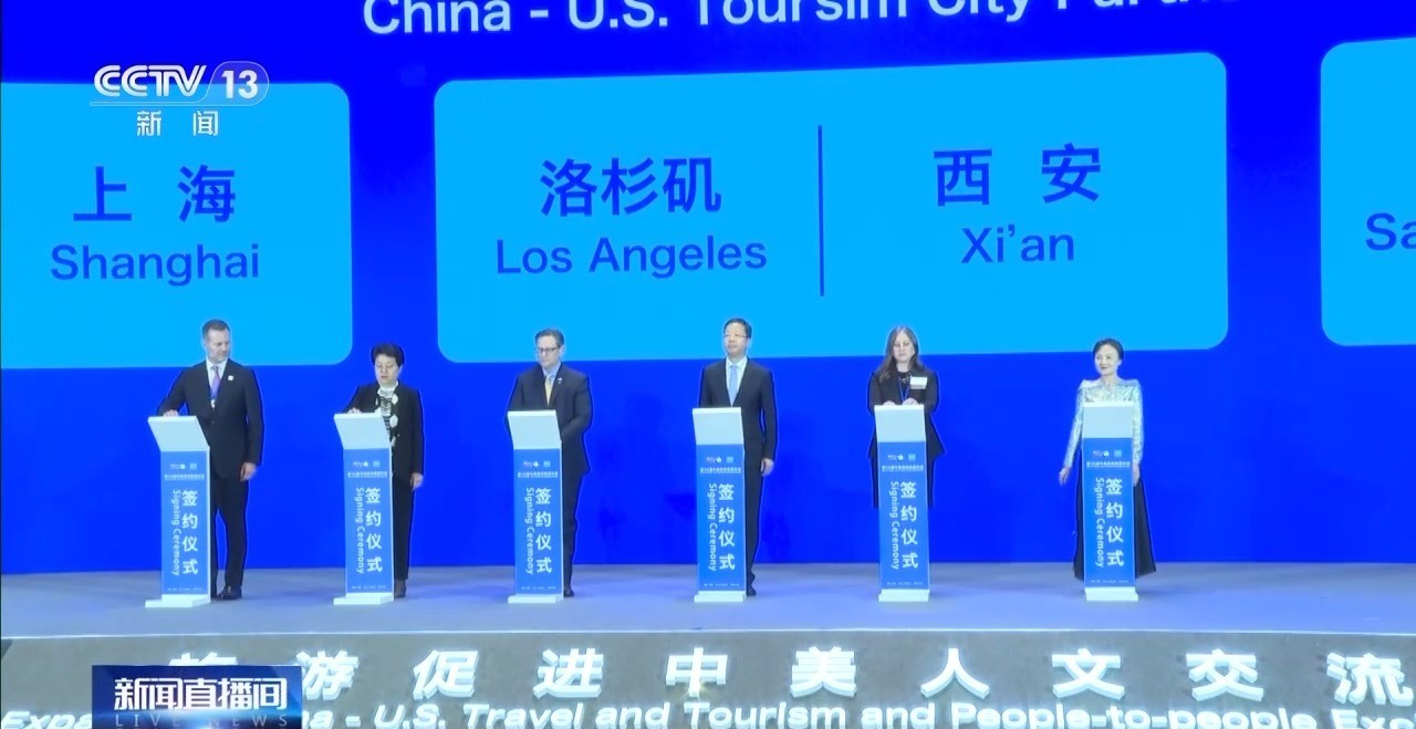 央視新聞報道截圖 現場舉行了簽約儀式,西安與洛杉磯、上海與紐約、深圳與舊金山成為中美旅遊夥伴城市。 第14屆中美旅遊高層對話由中國文化和旅遊部、陝西省政府、美國商務部、美國旅遊推廣局共同主辦。(完) 【編輯:丘志彬】