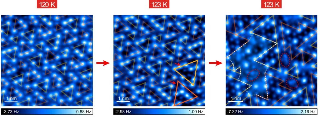 圖為隨著溫度昇高冰表面預融化過程的原子級分辨成像。(受訪者供圖) 中國科學院院士、輕元素平台理事長王恩哥表示,這項工作刷新了長期以來人們對冰表面結構和預融化機制的傳統認知,為冰科學研究打開了新的原子尺度視角。 《自然》對該研究進行專題報道。多位審稿人評論稱,團隊對冰表面進行原子級成像是重要的技術創新,所獲得的分辨率在冰表面成像中“前所未有”,這些發現可能對大氣科學、材料科學等多個領域產生深遠影響。(完) 【編輯:丘志彬】