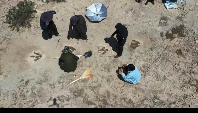 這些恐龍足跡化石最早由兩名當地村民上山牧羊時發現,報告給了中國自然資源部門。隨著勘測調查範圍擴大,越來越多的恐龍足跡化石持續被發現,截至5月26日,研究人員共發現恐龍足跡化石400多枚。 “這些腳印有三個類型的,一個是大型的蜥腳類,類似梁龍這個類型踩的;另外一個是類似霸王龍這個類型踩的;還有一個類型看上去像甲龍、劍龍這個類型踩的腳印化石。”祿豐市恐龍化石保護研究中心主任王濤介紹。