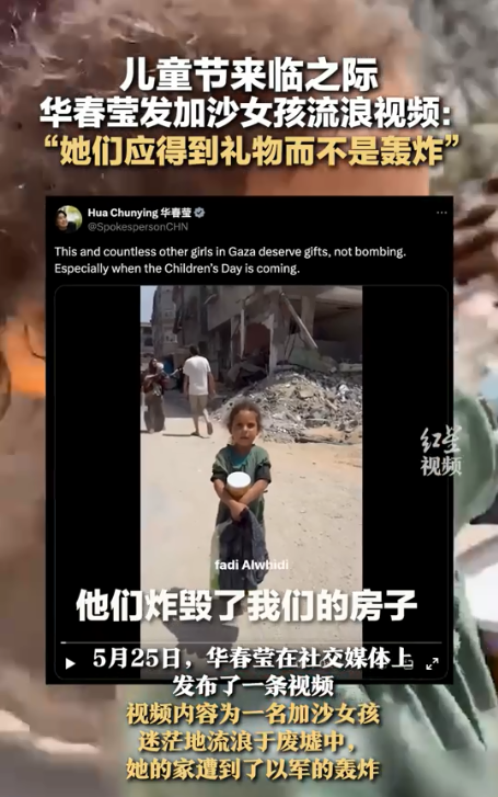 香港新聞網5月30日電 6月1日國際兒童節來臨之前,中國外交部副部長華春瑩在其社交媒體帳號X平台上發布了一條視頻,內容為一名加沙小女孩赤著腳,迷茫地流浪於廢墟中,她的家遭到了以軍的轟炸。震撼的畫面引起一眾網民共鳴,深深感受到戰火之中孩童的悲涼處境。