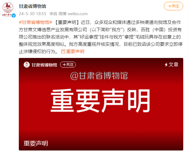 中國甘肅省博物館在聲明中稱,近日,眾多觀眾和媒體通過多種渠道向該館及合作方甘肅文博信息產業發展有限公司反映,百勝(中國)投資有限公司推出的聯名活動中,其“好運拿捏”掛件與甘肅省博物館、甘肅文博信息產業發展有限公司“拿捏”毛絨玩具存在創意上的整體視覺效果高度相似。 甘肅省博物館在聲明中說,“觀眾和媒體對於此次事件的關心與關注,我們深表感謝,後續我們會與該公司積極交涉,並保留採取法律手段保護我方知識產權的權利”。