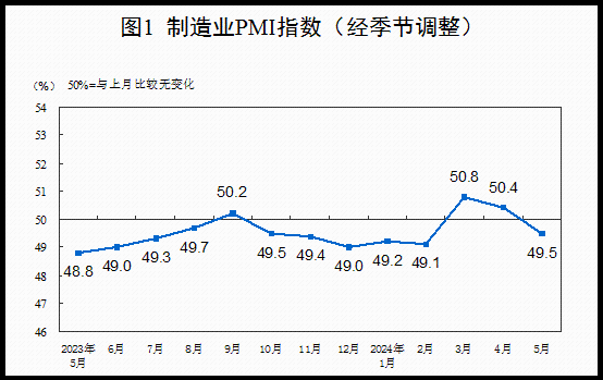 香港中通社5月31日電 中國國家統計局5月31日發布數據顯示,5月份,製造業採購經理指數(PMI)為49.5%,比上月下降0.9個百分點,製造業景氣水平有所回落。不過,5月份,非製造業商務活動指數為51.1%,與上月基本持平,非製造業繼續保持擴張。
