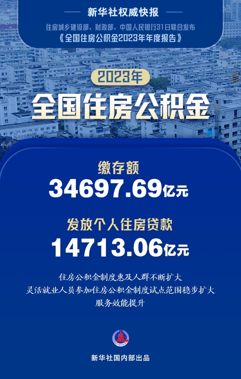 香港新聞網5月31日電 根據中國住房城鄉建設部、財政部、中國人民銀行31日聯合發佈的《全國住房公積金2023年年度報告》顯示,2023年,中國住房公積金各項業務運行平穩,住房公積金繳存額34697.69億元,7620.10萬人提取住房公積金26562.71億元,發放個人住房貸款286.09萬筆、14713.06億元。