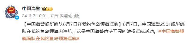 香港新聞網6月7日電 據中國海警局官方微博消息,6月7日,中國海警2501艦艇編隊在中國釣魚島領海內巡航。這是中國海警依法開展的維權巡航活動。