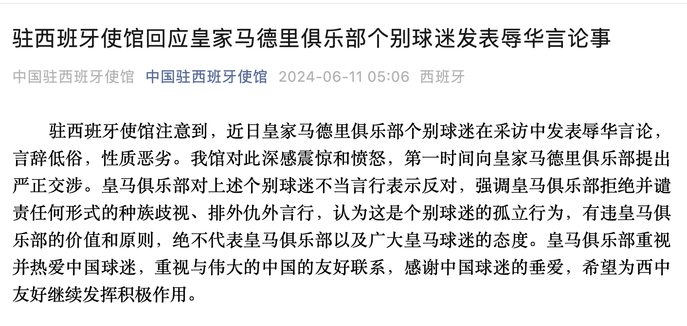 香港新聞網6月11日電 據中國駐西班牙使館6月11日消息,中國駐西班牙使館注意到,近日皇家馬德里俱樂部個別球迷在採訪中發表辱華言論,言辭低俗,性質惡劣。使館對此深感震驚和憤怒,第一時間向皇家馬德里俱樂部提出嚴正交涉。皇馬俱樂部對上述個別球迷不當言行表示反對,強調皇馬俱樂部拒絕并譴責任何形式的種族歧視、排外仇外言行,認為這是個別球迷的孤立行為,有違皇馬俱樂部的價值和原則,絕不代表皇馬俱樂部以及廣大皇馬球迷的態度。皇馬俱樂部重視并熱愛中國球迷,重視與偉大的中國的友好聯繫,感謝中國球迷的垂愛,希望為西中友好繼續發揮積極作用。