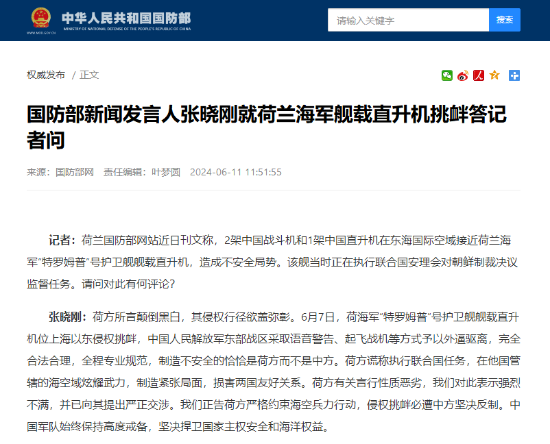 中國國防部網站截圖 張曉剛:荷方所言顛倒黑白,其侵權行徑欲蓋彌彰。6月7日,荷海軍“特羅姆普”號護衛艦艦載直升機位上海以東侵權挑釁,中國人民解放軍東部戰區採取語音警告、起飛戰機等方式予以外逼驅離,完全合法合理,全程專業規範,製造不安全的恰恰是荷方而不是中方。荷方謊稱執行聯合國任務,在他國管轄的海空域炫耀武力,製造緊張局面,損害兩國友好關係。荷方有關言行性質惡劣,我們對此表示強烈不滿,并已向其提出嚴正交涉。我們正告荷方嚴格約束海空兵力行動,侵權挑釁必遭中方堅決反制。中國軍隊始終保持高度戒備,堅決捍衛國家主權安全和海洋權益。(完) 【編輯:丘志彬】