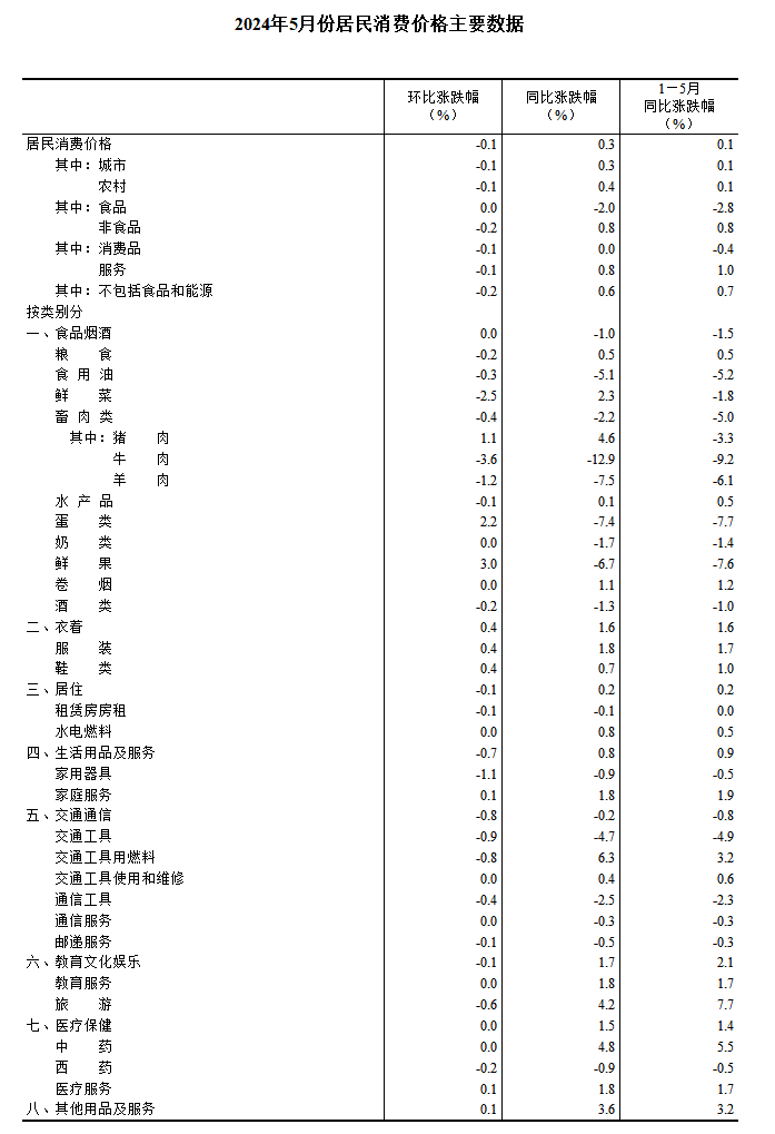 香港新聞網6月12日電 中國國家統計局網站6月12日發佈數據,2024年5月份,全國居民消費價格同比上漲0.3%。其中,城市上漲0.3%,農村上漲0.4%;食品價格下降2.0%,非食品價格上漲0.8%;消費品價格持平,服務價格上漲0.8%。1—5月平均,全國居民消費價格比上年同期上漲0.1%。 5月份,全國居民消費價格環比下降0.1%。其中,城市下降0.1%,農村下降0.1%;食品價格持平,非食品價格下降0.2%;消費品價格下降0.1%,服務價格下降0.1%。