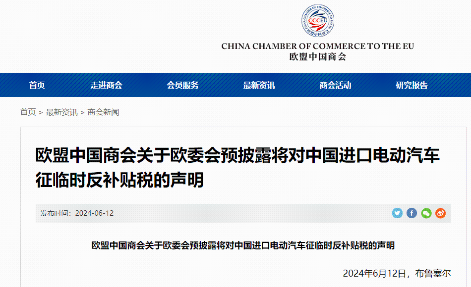 歐盟將對華電動汽車加征關稅,歐盟中國商會:扭曲市場公平競爭香港新聞網6月13日電 據歐盟中國商會網站消息,歐盟中國商會12日發佈關於歐委會預披露將對中國進口電動汽車征臨時反補貼稅的聲明。全文如下: 2024年6月12日,歐委會發佈了對自中國進口的電動汽車將於7月初開始征收臨時反補貼稅的預披露信息,歐盟中國商會對歐委會不顧各方勸阻、執意採取貿易保護主義行動的做法表示非常失望和強烈不滿。