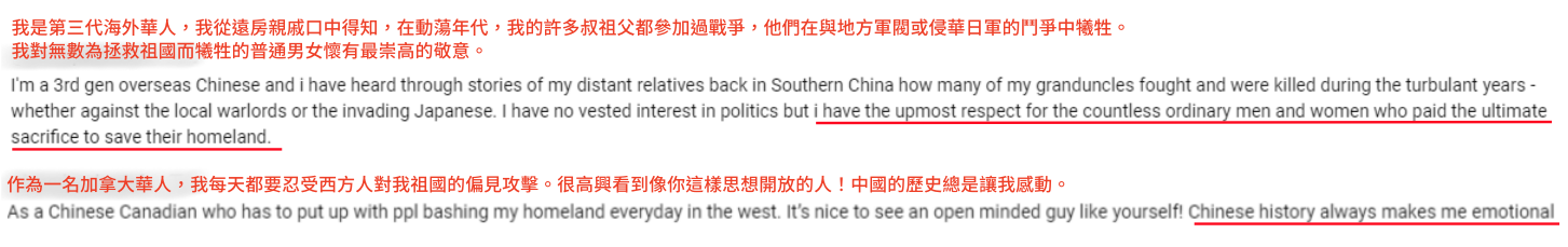 有第三代華人說,“我是第三代海外華人,我從中國南方的遠房親戚口中得知,在動蕩年代,我的許多叔祖父都參加過戰爭,他們在與地方軍閥或侵華日軍的鬥爭中犧牲。我對無數為拯救祖國而犧牲的普通男女懷有最崇高的敬意。”還有位加拿大華人表示,“作為一名加拿大華人,我每天都要忍受西方人對我祖國的偏見攻擊。很高興看到像你這樣思想開放的人!中國的歷史總是讓我感動。”(完) 【編輯:張依珊】