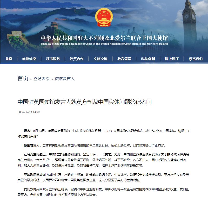 中國駐英國大使館網站截圖 中國駐英國使館發言人當天說,在烏克蘭問題上,中國的立場是勸和促談,堅定不移,一以貫之。為此,中國和巴西最近聯名發表了關於推動政治解決烏克蘭危機的“六點共識”,強調遵守局勢降溫三原則,即戰場不外溢、戰事不升級、各方不拱火,同時呼籲各方堅持對話談判、加大人道主義援助、反對使用核武器、反對攻擊核電站、維護全球產業鏈供應鏈穩定等。 發言人指,英國政府罔顧國內國際民意,不斷火上澆油,助長戰事延綿不絕、生靈塗炭,致使和平更加遙遙無期。英方不但沒有反思自己的惡劣行徑,反而羅織罪名制裁中國及其他國家企業,這充分暴露了英方的虛偽嘴臉。 發言人說,我們敦促英國政府立即糾正錯誤,撤銷對中國企業的制裁。中國政府將採取堅定有力措施維護中國企業合法權益。我們正告英方,任何損害中國利益的行徑都將遭到中方堅決回擊。(完) 【編輯:丘志彬】