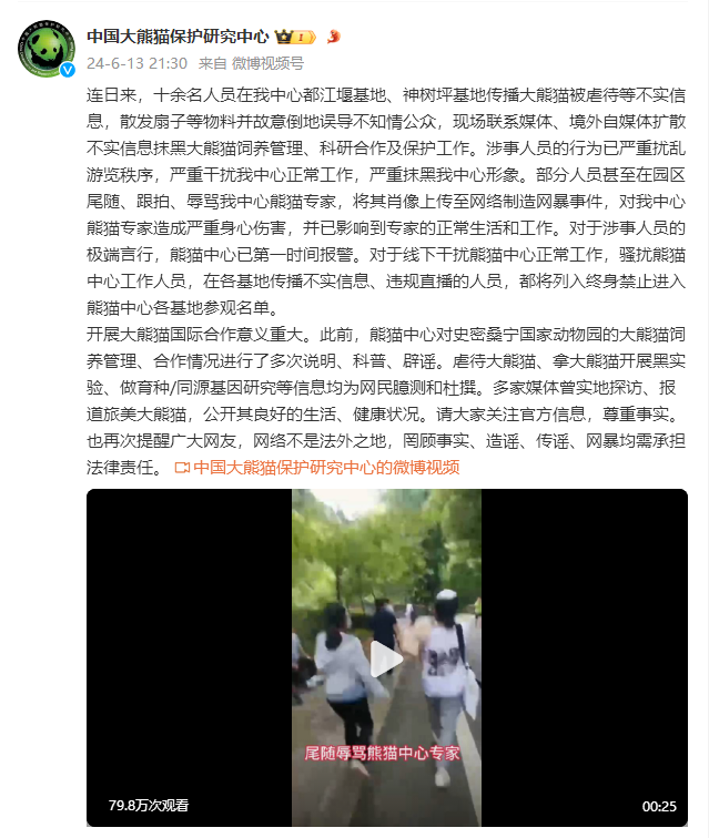 香港新聞網6月14日電 6月13日,中國大熊貓保護研究中心表示,連日來有十餘人傳播大熊貓被虐待等不實信息,已就事件報警。 聲明指,有人在大熊貓保護研究中心中心的都江堰基地、神樹坪基地傳播大熊貓被虐待等不實信息,派發扇子等物品,故意誤導公眾,並聯繫媒體及境外自媒體,散播不實信息,抹黑大熊貓飼養管理、科研合作及保護工作,更嚴重擾亂遊覽秩序,嚴重干擾熊貓中心正常工作,部分人甚至在園區尾隨、跟拍、辱罵中心的熊貓專家,拍攝專家照片並在網絡發布,對熊貓專家造成身心傷害,影響到專家的正常生活和工作。對於涉事人員的極端言行,熊貓中心已報警,對於干擾熊貓中心正常工作,騷擾工作人員,在各基地傳播不實信息、違規直播的人員,都將列入終身禁止進入熊貓中心各基地參觀名單。