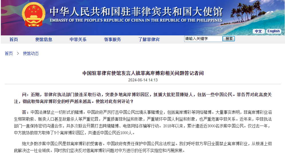 中國駐菲律賓大使館網站截圖 據中國駐菲律賓大使館微信公眾號14日消息,發言人說,中國法律禁止一切形式的賭博。中國政府嚴厲打擊中國公民出境從事賭博業,包括離岸博彩等網絡賭博。大量事實表明,菲離岸博彩業滋生綁架勒索、販賣人口甚至故意殺人等嚴重犯罪,嚴重損害菲利益和形象,嚴重破壞中國人利益和形象,也嚴重危害中菲關係。 發言人表示,近年來,中菲執法部門一直保持密切溝通合作,並多次聯合開展打擊跨境賭博、電信網絡詐騙等行動。2018年以來,累計遣返近3000名涉案中國公民。僅過去一年,中方就協助菲方取締了5個離岸博彩園區,共遣返中國公民近1000人。 發言人指出,絕大多數涉案中國公民是菲離岸博彩的受害者。中國政府有責任保護中國公民合法權益。中方堅決反對借離岸博彩問題對中方進行的任何不實指控和污蔑抹黑。(完) 【編輯:馬華】