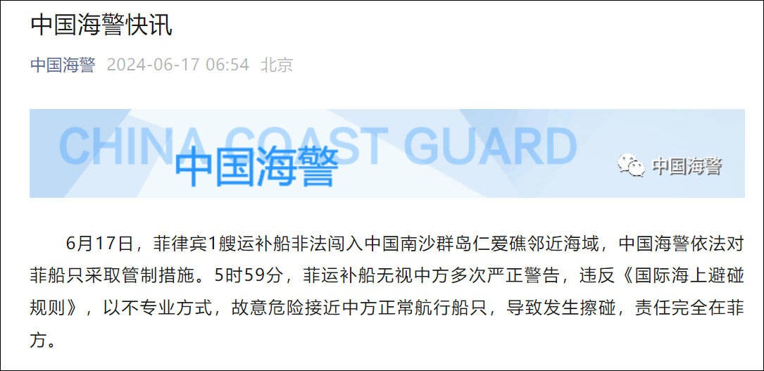 香港新聞網6月17日電 據中國海警微信公眾號17日消息,6月17日,菲律賓1艘運補船非法闖入中國南沙群島仁愛礁鄰近海域,中國海警依法對菲船隻採取管制措施。5時59分,菲運補船無視中方多次嚴正警告,違反《國際海上避碰規則》,以不專業方式,故意危險接近中方正常航行船隻,導致發生擦碰,責任完全在菲方。(完)
