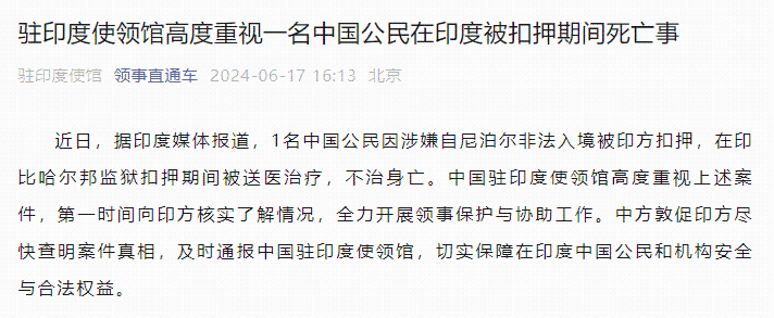 香港新聞網6月17日電 據中國外交部領事司微信公眾號“領事直通車”17日消息,近日,據印度媒體報道,1名中國公民因涉嫌自尼泊爾非法入境被印方扣押,在印比哈爾邦監獄扣押期間被送醫治療,不治身亡。