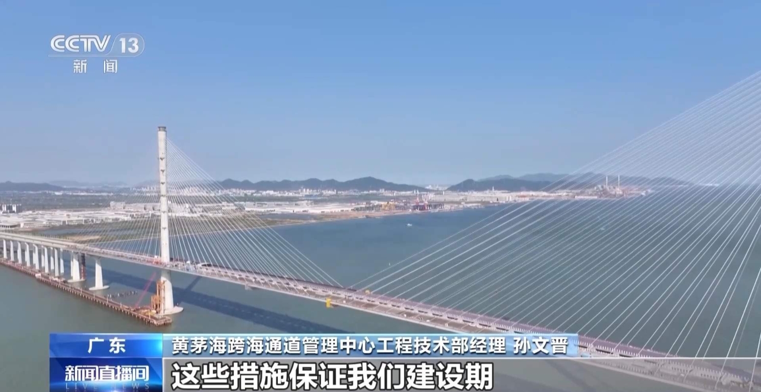 黃茅海跨海通道管理中心工程技術部經理 孫文晉:我們目前最大懸臂狀態,是我們橋抗風最薄弱的階段。這個階段,我們在橋位有一些抗風臨時支架,以及我們臨時的阻尼器,這些措施保證我們建設期抵抗各種不利工況的颱風影響,保證我們結構安全。 除了抗擊颱風以外,黃茅海大橋的幾座斜拉橋,還遭遇了渦振現象的困擾。也就是在風速不高時,橋面會出現有限幅度的震動,雖然不會威脅橋樑結構,但是對於行駛在大橋上面的車輛,會帶來晃動的行駛體驗,影響車輛行駛的舒適性。