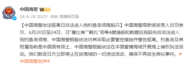 香港中通社6月24日電 中國海警局新聞發言人甘羽24日表示,6月20日至24日,日“惠比壽”“鶴丸”號等4艘漁船和數艘巡視船先後非法進入中國釣魚島領海,中國海警艦艇依法對其採取必要管控措施並警告驅離。