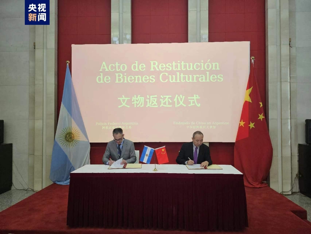 中國駐阿根廷大使王衛與阿根廷聯邦警察總局國際局局長馬塞洛·恰佩羅(Marcelo Chiapero)簽署文物返還確認書。(本文圖片均來自於央視新聞)