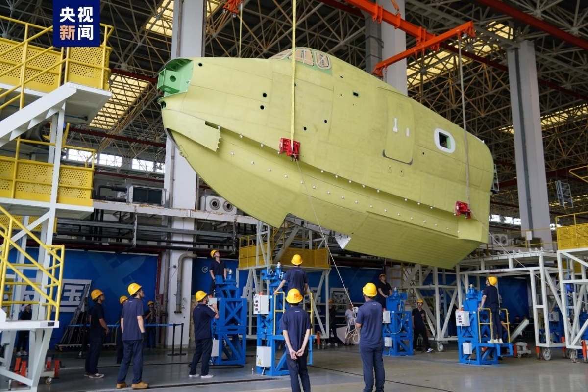 香港新聞網7月1日電 據中國航空工業集團7月1日消息,中國自主研製的大型水陸兩棲飛機AG600批產首架機的機頭大部件完成交付,標誌著這型飛機小批量總裝生產工作正式開啟。