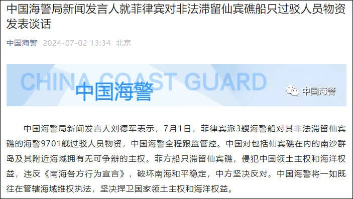 香港新聞網7月2日電 據微信公眾號“中國海警”7月2日消息,中國海警局新聞發言人劉德軍表示,7月1日,菲律賓派3艘海警船對其非法滯留仙賓礁的海警9701艦過駁人員物資,中國海警全程跟監管控。中國對包括仙賓礁在內的南沙群島及其附近海域擁有無可爭辯的主權。菲方船隻滯留仙賓礁,侵犯中國領土主權和海洋權益,違反《南海各方行為宣言》,破壞南海和平穩定,中方堅決反對。中國海警將一如既往在管轄海域維權執法,堅決捍衛國家領土主權和海洋權益。