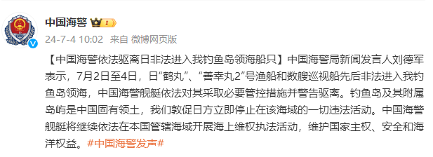 香港新聞網7月4日電 中國海警局新聞發言人劉德軍表示,7月2日至4日,日“鶴丸”、“善幸丸2”號漁船和數艘巡視船先後非法進入我釣魚島領海,中國海警艦艇依法對其採取必要管控措施并警告驅離。釣魚島及其附屬島嶼是中國固有領土,我們敦促日方立即停止在該海域的一切違法活動。中國海警艦艇將繼續依法在本國管轄海域開展海上維權執法活動,維護國家主權、安全和海洋權益。