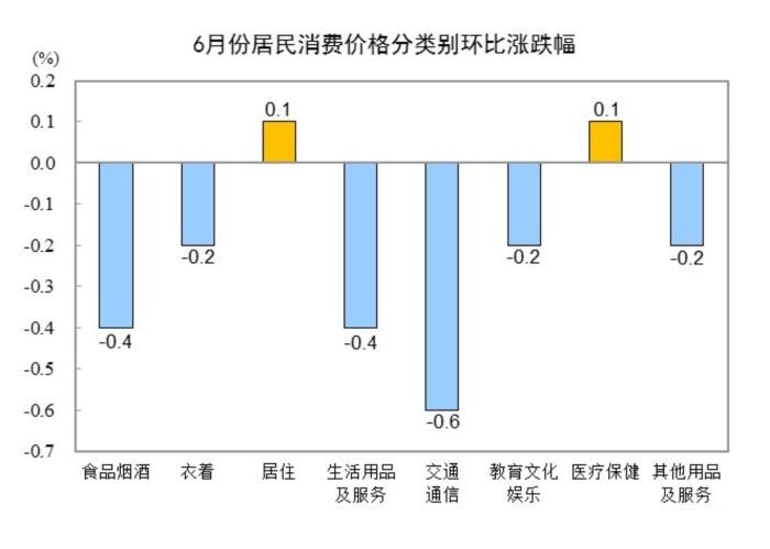 本文圖片均來源自中國國家統計局網站 一、各類商品及服務價格同比變動情況 6月份,食品煙酒類價格同比下降1.1%,影響CPI(居民消費價格指數)下降約0.31個百分點。食品中,鮮果價格下降8.7%,影響CPI下降約0.19個百分點;鮮菜價格下降7.3%,影響CPI下降約0.15個百分點;蛋類價格下降3.9%,影響CPI下降約0.03個百分點;畜肉類價格上漲3.5%,影響CPI上漲約0.10個百分點,其中豬肉價格上漲18.1%,影響CPI上漲約0.21個百分點;水產品價格上漲1.2%,影響CPI上漲約0.02個百分點;糧食價格上漲0.4%,影響CPI上漲約0.01個百分點。 其他七大類價格同比六漲一降。其中,其他用品及服務、教育文化娛樂價格分別上漲4.0%和1.7%,衣著、醫療保健價格均上漲1.5%,生活用品及服務、居住價格分別上漲0.9%和0.2%;交通通信價格下降0.3%。