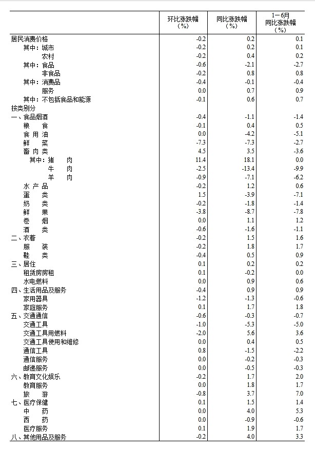 二、各類商品及服務價格環比變動情況 6月份,食品煙酒類價格環比下降0.4%,影響CPI下降約0.10個百分點。食品中,鮮菜價格下降7.3%,影響CPI下降約0.15個百分點;鮮果價格下降3.8%,影響CPI下降約0.08個百分點;畜肉類價格上漲4.5%,影響CPI上漲約0.13個百分點,其中豬肉價格上漲11.4%,影響CPI上漲約0.14個百分點;蛋類價格上漲1.5%,影響CPI上漲約0.01個百分點。 其他七大類價格環比兩漲五降。其中,居住、醫療保健價格均上漲0.1%;交通通信、生活用品及服務價格分別下降0.6%和0.4%,衣著、教育文化娛樂、其他用品及服務價格均下降0.2%。