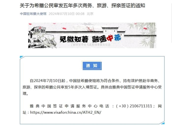 中使館:為希臘公民審發五年多次商務、旅游、探親簽證