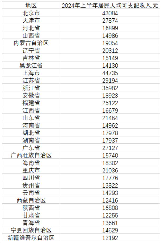 香港新聞網7月18日電 近日,中國國家統計局網站公佈了31個省份2024年上半年居民人均可支配收入情況。數據顯示,今年上半年,有10個省份居民人均可支配收入超過了兩萬元。