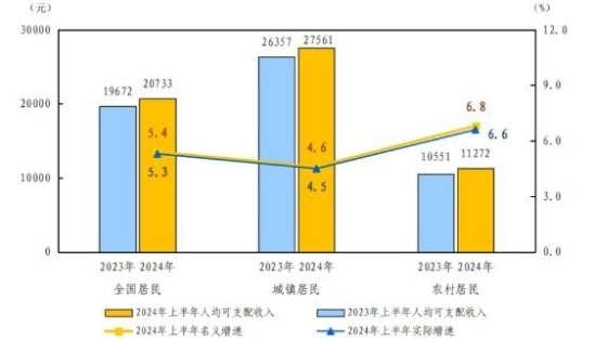 香港中通社圖片 據第一財經報道,中國國家統計局15日發佈的數據顯示,上半年,全國居民人均可支配收入20733元,比上年同期名義增長5.4%;扣除價格因素,實際增長5.3%。分城鄉看,城鎮居民人均可支配收入27561元,比上年同期名義增長4.6%,扣除價格因素,實際增長4.5%;農村居民人均可支配收入11272元,比上年同期名義增長6.8%,扣除價格因素,實際增長6.6%。 分省份來看,今年上半年,共有10個省份的居民人均可支配收入超過兩萬元,其中,上海上半年居民人均可支配收入達到了44735元,位居第一;北京上半年居民人均可支配收入達43084元,位居第二。相對來說,其他省份與上海、北京均有較大差距。