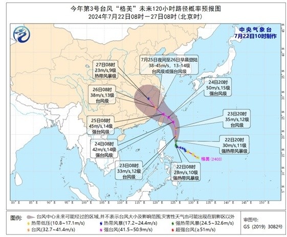 香港新聞網7月22日電 今年第3號颱風“格美”的中心今天(7月22日)上午8點鐘位於菲律賓馬尼拉東北方向約530公里的菲律賓以東洋面上,也就是北緯17.4度、東經125.0度,中心附近最大風力10級(28米/秒),中心最低氣壓982百帕,七級風圈半徑200—220公里,十級風圈半徑80—100公里。