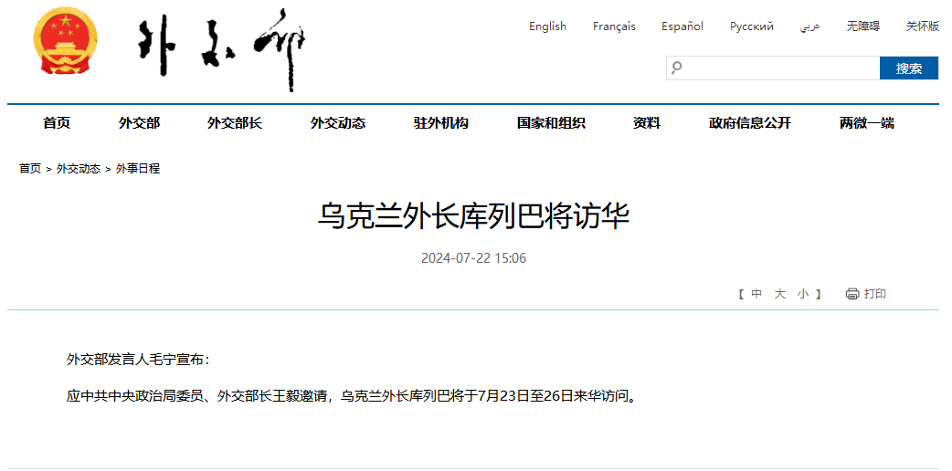 香港新聞網7月22日電 據中國外交部網站7月22日消息,中國外交部發言人毛寧宣佈:應中共中央政治局委員、外交部長王毅邀請,烏克蘭外長庫列巴將於7月23日至26日來華訪問。