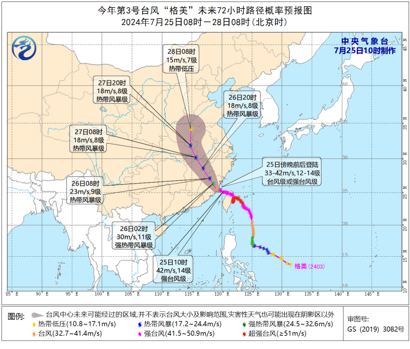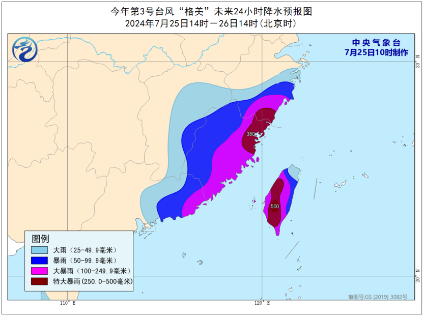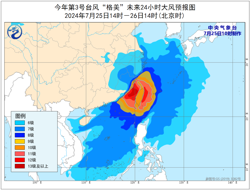 大風預報:7月25日14時至26日14時,黃海南部、東海大部、巴士海峽、南海大部、華東和華南沿海、長江口區、杭州灣將有7-8級大風,其中東海南部及釣魚島附近海域、台灣海峽、台灣以東洋面、台灣島沿海、福建沿海、浙江東南部沿海的風力有9-12級,“格美”中心經過的附近海面或地區的風力有13-14級,陣風15-16級;另外上海、江蘇南部、安徽南部、江西東部、福建西部、浙江中北部等地也將有6-7級的大風。