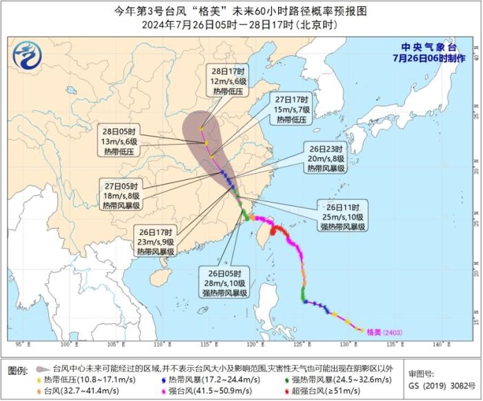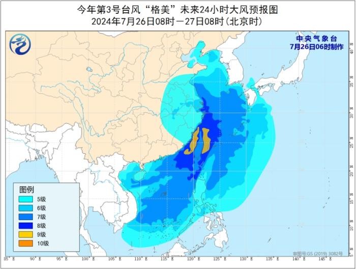 香港新聞網7月26日電 中國中央氣象台7月26日06時發佈颱風橙色預警: 今年第3號颱風“格美”已於昨天(25日)晚上9點鐘由颱風級減弱為強熱帶風暴級,今天(26日)早晨5點鐘其中心位於中國福建省福州市永泰縣境內,就是北緯25.8度、東經118.6度,最大風力有10級(28米/秒),中心最低氣壓為977百帕。