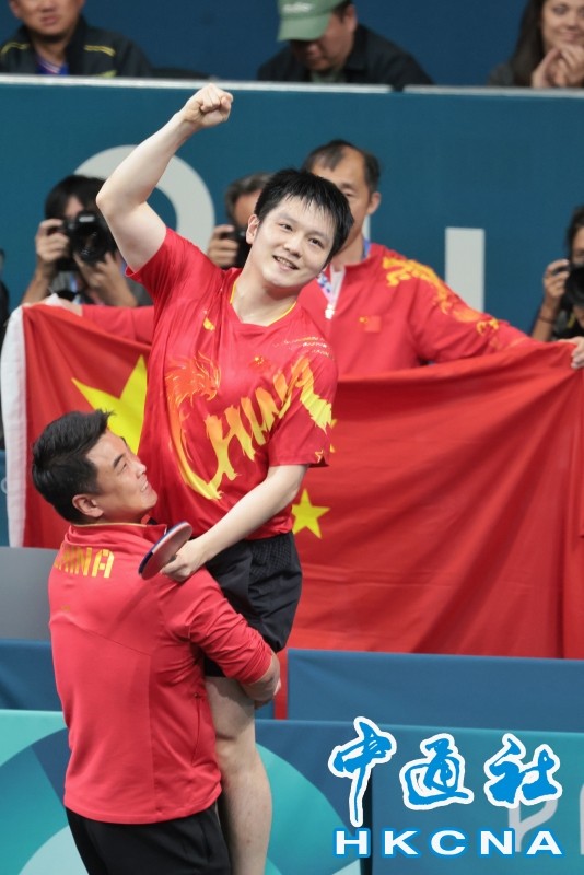 圖為中國選手樊振東 來源:香港中通社 當日的乒乓球男單決賽,樊振東4:1輕鬆戰勝瑞典選手莫雷加德,繼上屆東京奧運摘銀後,收獲個人首個奧運單打冠軍。巴黎奧運會,樊振東曾在男單1/4決賽頂住落後壓力,4:3險勝日本名將張本智和;此後半決賽又4: 0橫掃法國新秀F·勒布倫。 決賽後,樊振東的教練、曾經的國乒主力王皓激動歡呼,把樊振東高高抱起。