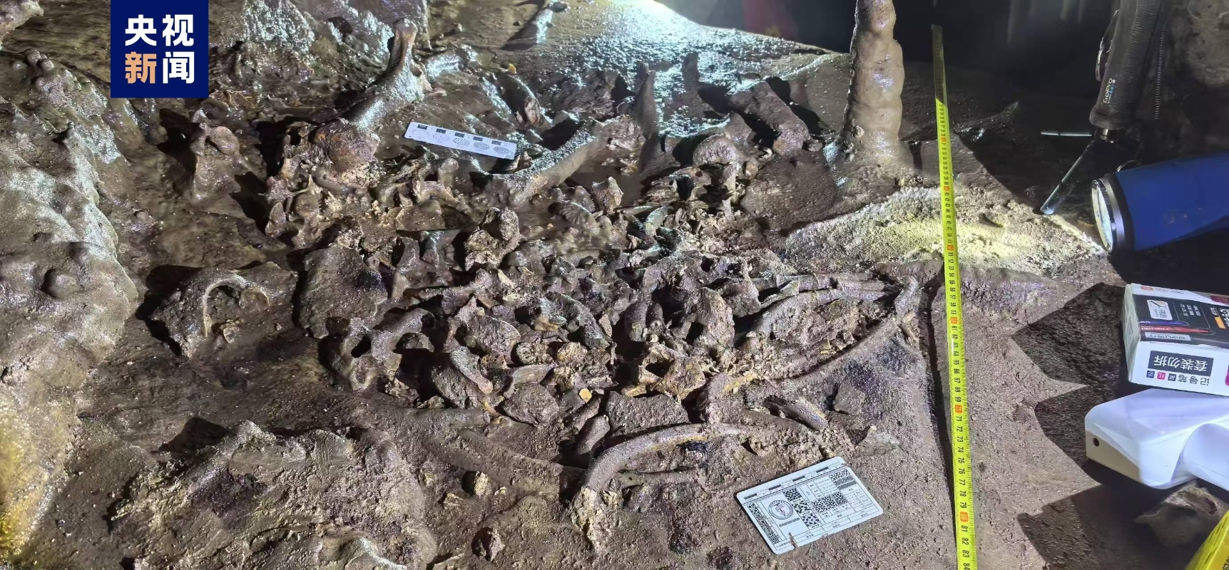 △攝影:王迪 武濤 發現大熊貓化石的地點位於漢中市城固縣一處溶洞內,洞深約180米。大熊貓化石在溶洞深處一個石灰岩平台上。周邊環境陰暗潮濕,化石保存位置上部洞頂不斷有水滴落,下部還有一條暗河。專家介紹,“大熊貓化石骨架膠結在灰岩平台,露出岩石表面,化石表面有次生碳酸鈣沉積,面積約有1平方米。肱骨、股骨、脊椎、肋骨等大熊貓頭後骨骼清晰可見,長度3~20厘米不等。”