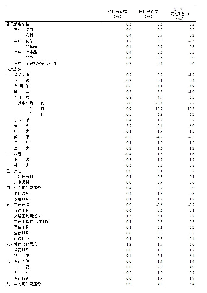 本文圖片均來自中國國家統計局網站。 一、各類商品及服務價格同比變動情況 7月份,食品煙酒類價格同比上漲0.2%,影響CPI(居民消費價格指數)上漲約0.07個百分點。食品中,畜肉類價格上漲4.9%,影響CPI上漲約0.14個百分點,其中豬肉價格上漲20.4%,影響CPI上漲約0.24個百分點;鮮菜價格上漲3.3%,影響CPI上漲約0.07個百分點;水產品價格上漲1.2%,影響CPI上漲約0.02個百分點;鮮果價格下降4.2%,影響CPI下降約0.09個百分點。 其他七大類價格同比六漲一降。其中,其他用品及服務、教育文化娛樂價格分別上漲4.0%和1.7%,衣著、醫療保健價格分別上漲1.5%和1.4%,生活用品及服務、居住價格分別上漲0.7%和0.1%;交通通信價格下降0.6%。