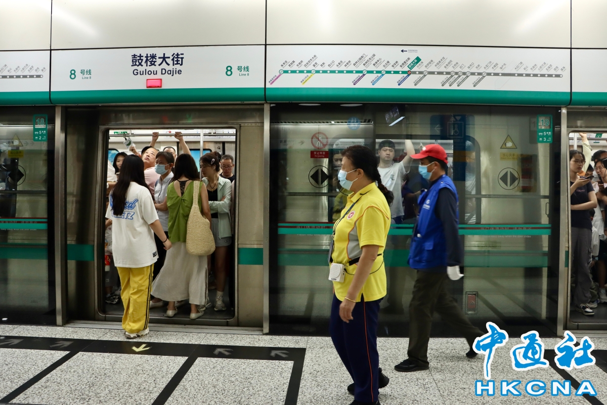 香港中通社北京8月11日電 (香港中通社特約記者 莊恭百)正值暑期,北京地鐵八號線顯得人氣更旺。來自天南海北的乘客擠滿車廂,高峰時段進出站口經常排起長龍。“這條線每天人都很多,剛才那一大撥是去奧體中心看演唱會的。”八號線鼓樓大街站,文明引導員劉麗萍正在引導乘客們有序換乘與上下車。