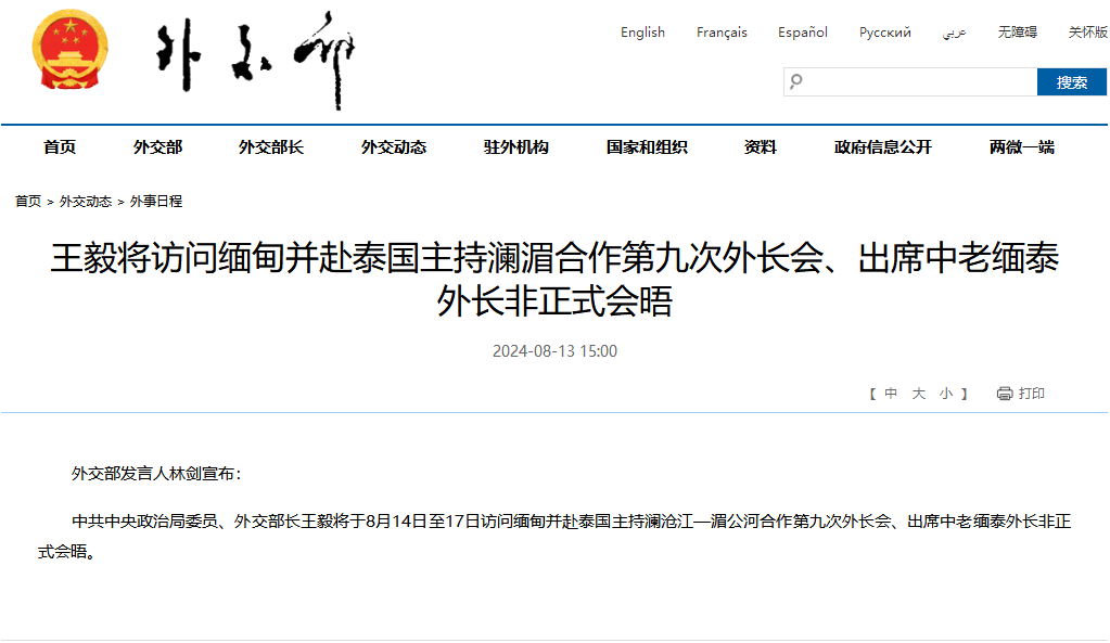 香港新聞網8月13日電 據中國外交部網站8月13日消息,中國外交部發言人林劍宣佈:中國外交部長王毅將於8月14日至17日訪問緬甸并赴泰國主持瀾滄江—湄公河合作第九次外長會、出席中老緬泰外長非正式會晤。