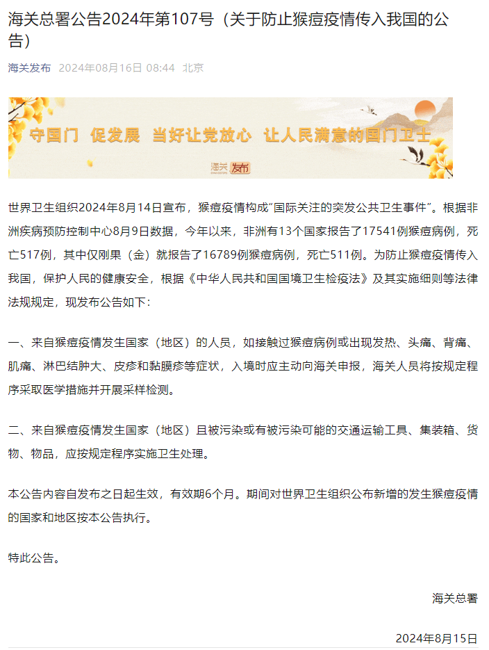 全文如下: 世界衛生組織2024年8月14日宣布,猴痘疫情構成“國際關注的突發公共衛生事件”。根據非洲疾病預防控制中心8月9日數據,今年以來,非洲有13個國家報告了17541例猴痘病例,死亡517例,其中僅剛果(金)就報告了16789例猴痘病例,死亡511例。為防止猴痘疫情傳入我國,保護人民的健康安全,根據《中華人民共和國國境衛生檢疫法》及其實施細則等法律法規規定,現發佈公告如下: 一、來自猴痘疫情發生國家(地區)的人員,如接觸過猴痘病例或出現發熱、頭痛、背痛、肌痛、淋巴結腫大、皮疹和黏膜疹等症狀,入境時應主動向海關申報,海關人員將按規定程序採取醫學措施并開展採樣檢測。 二、來自猴痘疫情發生國家(地區)且被污染或有被污染可能的交通運輸工具、集裝箱、貨物、物品,應按規定程序實施衛生處理。 本公告內容自發佈之日起生效,有效期6個月。期間對世界衛生組織公佈新增的發生猴痘疫情的國家和地區按本公告執行。 特此公告。 海關總署 2024年8月15日 (完) 【編輯:丘志彬】