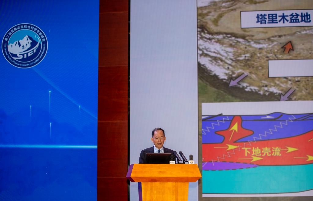 8月18日,第二次青藏科考隊隊長姚檀棟院士在拉薩對本次科考十大任務的重要成果進行集中發佈。新華社記者 姜帆 攝 十大標誌性進展包括:闡釋青藏高原生態保護的系統性和特殊性,全過程科學支撐青藏高原生態保護立法;闡明氣候變化影響下“亞洲水塔”失衡特征和影響,科技支撐水資源與水安全戰略;厘清氣候變化影響下青藏高原碳匯功能和變化特征,科技應對氣候變化并服務“雙碳”目標;解析青藏高原生態系統和生物多樣性變化,優化國家生態安全屏障體系建設;開展青藏高原隆升過程與環境演化研究,評估國家戰略資源儲備基地的礦產資源現狀與遠景;揭示青藏高原自然災害時空規律和成災機制,保障重大工程建設和運維安全;揭示青藏高原人類活動過程,提出區域綠色可持續發展模式;融合國際組織和國際計劃,為全球生態環境保護提供中國方案和智慧;構建地球系統多圈層綜合觀測與預警平台,服務山水林田湖草沙冰一體化保護與系統治理;創造“巔峰使命”極高海拔科考多項世界紀錄,樹立世界級原創性科考活動標桿。