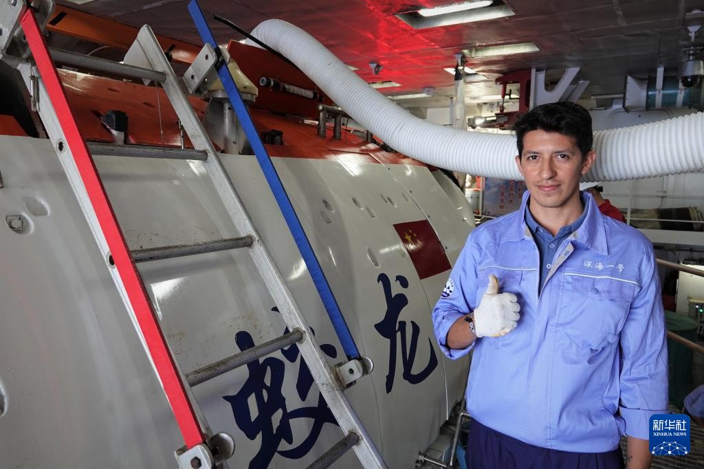 8月19日,哥倫比亞科學家海梅·安德烈斯與“蛟龍號”合影。新華社記者 王聿昊 攝 據傅文韜介紹,當天的下潛在西太平洋海域一座尚未正式命名的海山山坡進行,重點對底棲生物和水體環境進行調查,觀察拍攝了海底生物分布情況,採集到多個品種的海參、海綿、冷水珊瑚以及底層海水、沉積物等樣品。當日最大下潛深度為3333米,水下作業約6個小時。