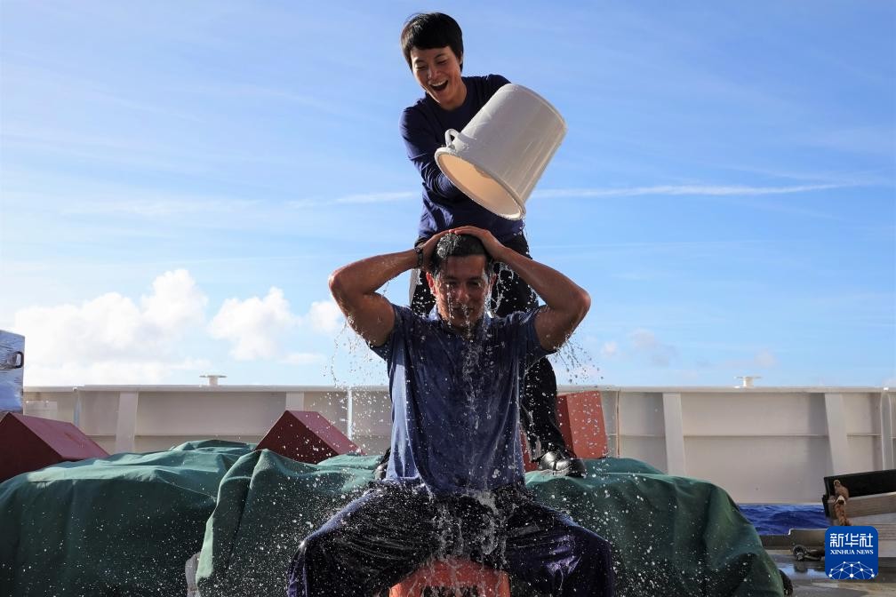8月19日,哥倫比亞科學家海梅·安德烈斯完成下潛後,接受潛航員趙晟婭的潑水慶祝。新華社記者 王聿昊 攝