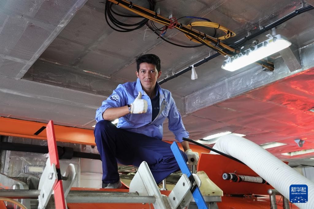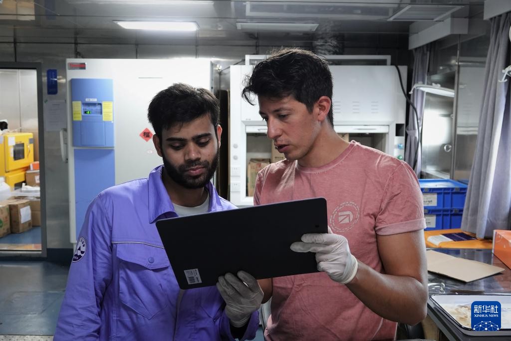 8月19日,哥倫比亞科學家海梅·安德烈斯(右)完成下潛後,與孟加拉國科學家阿蔔杜勒·卡里姆在船上實驗室交流深海生物樣品採集情況。新華社記者 王聿昊 攝 從事海洋生態保護研究的安德烈斯說,此次下潛是他最寶貴的人生經歷,船上各個團隊的成員都給予他大力支持。“中國的潛航員不僅精通潛水器駕駛,還是海洋生物專家,他們帶領我辨認了很多海底生物,採集到長度近半米的海參等代表性樣品,我們高效完成了科學目標。” 本航次境外首席科學家、香港浸會大學教授邱建文表示,2024西太平洋國際航次科考是中外科學家攜手開展海洋生物多樣性保護研究的寶貴機會。大家來自不同國家,擅長海洋生物、地質、生態等不同領域,但都在交流互鑒中推動了彼此的研究。