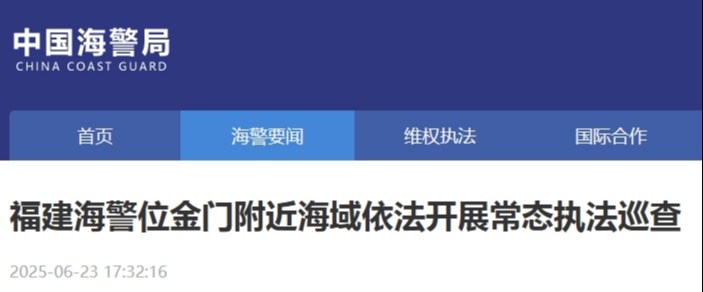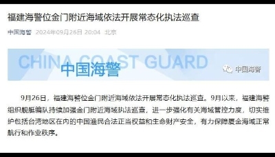 香港中通社8月21日電 中國海警局21日公告,福建海警當天位金門附近海域依法開展常態化執法巡查,正值該海域伏季休漁結束,將進一步強化有關海域管控力度。