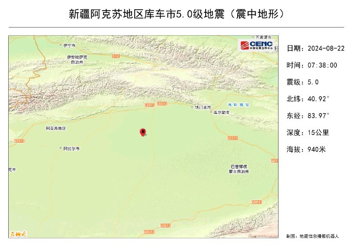 香港中通社8月22日電 據中國地震台網測定,22日7時38分在新疆阿克蘇地區庫車市發生5級地震,震源深度15公里,震中位於北緯40.92度,東經83.97度。
