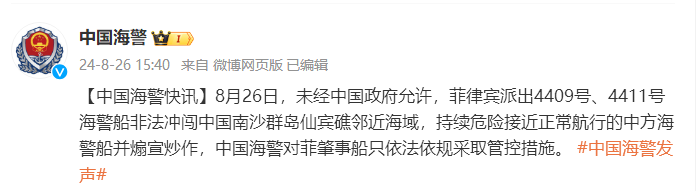 香港新聞網8月26日電 據中國海警局官方微博消息,8月26日,未經中國政府允許,菲律賓派出4409號、4411號海警船非法沖闖中國南沙群島仙賓礁鄰近海域,持續危險接近正常航行的中方海警船並煽宣炒作,中國海警對菲肇事船隻依法依規採取管控措施。